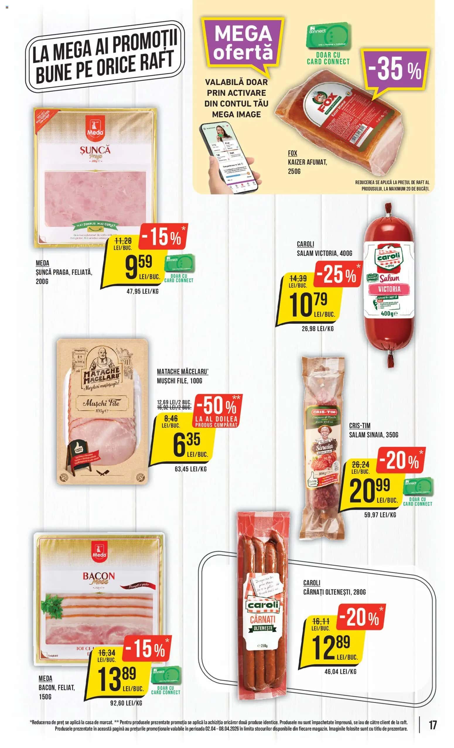 Răsfoiți acest catalog Mega Image actual în perioada 02.04.2026 - 21.04.2026 pentru a vedea ultimele oferte. În paginile 28 ale revistei online veți găsi cele mai recente cataloage și oferte din categoria Supermarketuri. Acest catalog Mega Image oferă reduceri la peste 889 produse la reducere Mega Image și astfel beneficiați de cea mai bună ofertă la lucrurile pe care le cumpărați! În plianta actuală veți găsi Reduceri, oferte și prețuri la produse șuncă, şuncă praga, Kaizer, Kaizer afumat, Kaiser, Mușchi file afumat, Salam, salam victoria, Salam, salam sinaia, bacon, Cârnați, cârnați oltenești. Catalogul Mega Image oferă multe alte promoții la mărfuri lista o puteți găsi mai jos.